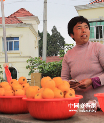 白玉村民在路邊向游客銷(xiāo)售枇杷。她家里有100多棵枇杷樹(shù),今年收成不錯(cuò),收入可以有2—3萬(wàn)元。 (中國(guó)臺(tái)灣網(wǎng) 田云鵬 攝)