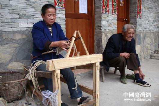 “吉娜”羌寨里的老夫妻,震前種地為生,現(xiàn)在搬進(jìn)新居,手工制作鞋子來賣給游客,老伴還試穿給記者看,(中國臺灣網(wǎng) 鐘寶華 攝)