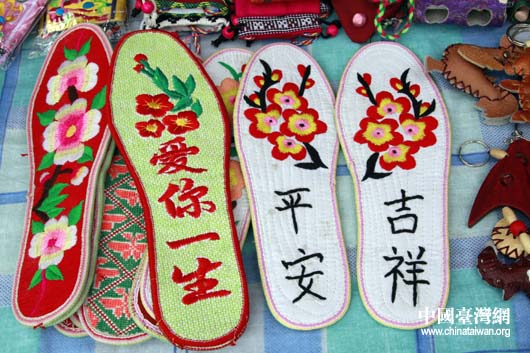 在攤位前,記者還發(fā)現(xiàn)了秀有“吉祥”、“平安”、“愛你一生”等字樣的鞋墊,羌家妹子說,繡上這些文字,既表達(dá)對地震中死難同胞的思念,也送出對震后生者的美好祝福。