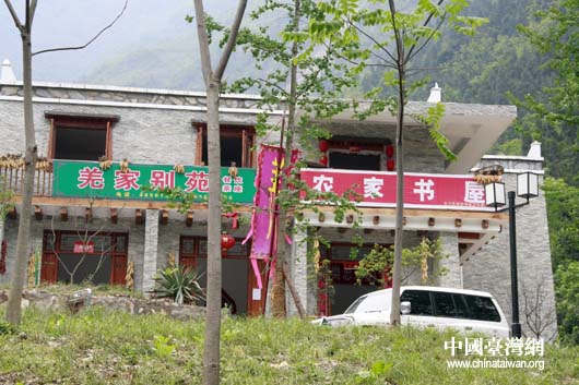 “吉娜”羌寨里的農(nóng)家做起旅游生意,打出招牌招攬游客。(中國臺灣網(wǎng) 鐘寶華 攝)