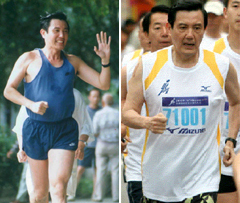 圖左,1998年5月31日,馬英九在30日宣布參選臺北市長,在住所附近興隆公園晨跑,10.5公里成績是47分55秒。圖右,2009年4月19日,馬英九在宜蘭蔣渭水高速公路參加馬拉松比賽,5公里耗時27分43秒。來源:臺灣《聯(lián)合報》