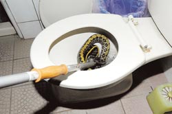報道稱,這出宛如驚悚電影般的劇情,發(fā)生在五十歲的林姓男子身上。他余悸猶存地說,八日傍晚坐馬桶小解,一坐上去突感下體像被刀刺穿般的痛楚,反射本能地站了起來,回頭一看,一條大蛇竟卡在水管內(nèi),在馬桶洞口昂首擺動吐舌信。因怕蛇跑出來傷人,林姓男子按下沖水按鈕,但怎么沖都沖不掉,于是拿起馬桶刷戳蛇依然無果后,只好蓋上馬桶蓋向鄰居求救。