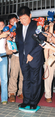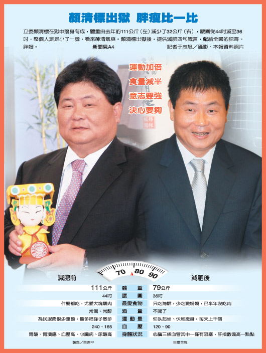 臺“立委”顏清標(biāo)昨天下午假釋出獄,明顯小一號的他甩掉32公斤,在電子媒體的慫恿下站上事先預(yù)備的體重計,顯示減重成果。圖片來源:臺灣《聯(lián)合報》