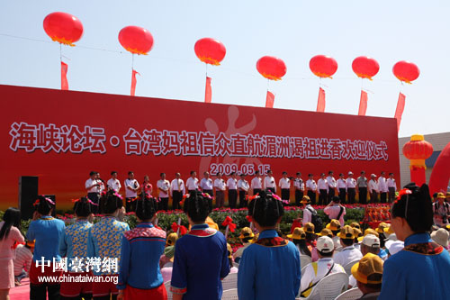 臺(tái)灣媽祖信眾直航湄洲進(jìn)香團(tuán)今天下午抵達(dá)湄洲碼頭,圖為歡迎儀式現(xiàn)場(chǎng)。(中國臺(tái)灣網(wǎng)記者 張弛 攝)