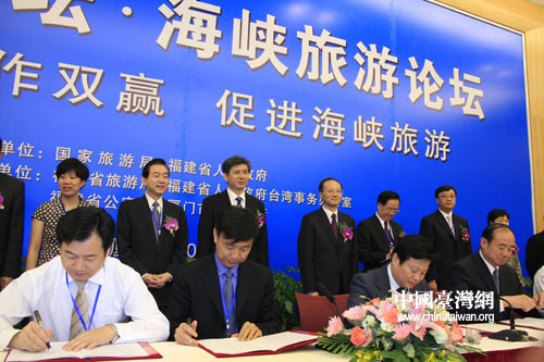 大陸25個(gè)赴臺(tái)旅游地省市旅游局在論壇上共同簽署《打造“小三通”旅游黃金通道合作宣言》。福建省旅游協(xié)會(huì)和臺(tái)灣六大旅游公會(huì)簽訂《閩臺(tái)旅游合作品質(zhì)保障協(xié)議》。(記者 鐘寶華 許雯)