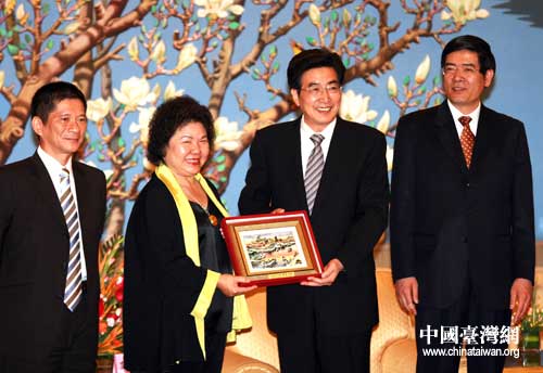 北京市長郭金龍今天在北京飯店會(huì)見了率團(tuán)來訪的高雄市長陳菊。圖為陳菊向郭金龍贈(zèng)送精美禮品。(中國臺(tái)灣網(wǎng) 田云鵬 攝)