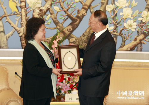 22日下午,中國奧委會主席劉鵬在北京飯店會見了高雄市市長陳菊一行。圖為陳菊向劉鵬贈送臺灣少數民族傳統(tǒng)工藝品。(中國臺灣網 田云鵬 攝)