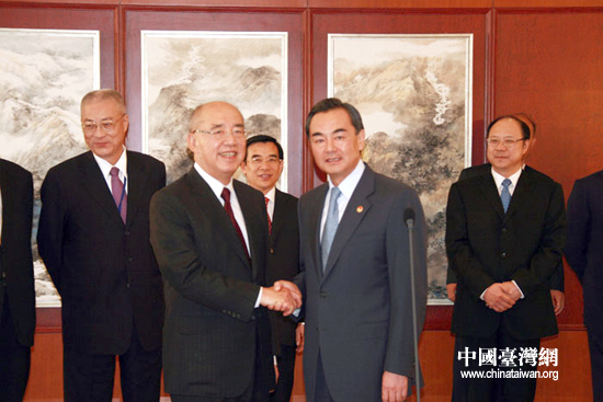中國(guó)國(guó)民黨主席吳伯雄率領(lǐng)中國(guó)國(guó)民黨大陸訪問(wèn)團(tuán)于25日11時(shí)5分許乘機(jī)抵達(dá)北京,開始訪問(wèn)大陸行程。中共中央臺(tái)辦主任王毅到機(jī)場(chǎng)迎接。(中國(guó)臺(tái)灣網(wǎng) 鐘寶華 攝)