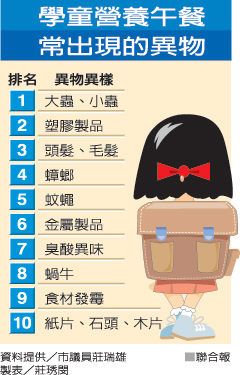 莊瑞雄并向臺北市教育局調(diào)閱近兩年來各小學(xué)營養(yǎng)午餐紀(jì)錄,發(fā)現(xiàn)菜肴里曾出現(xiàn)各種蟲類的共有109件;其次是塑料片、塑料袋碎屑,共有92件,另外毛發(fā)也高達(dá)40件;讓人覺得可怕的還有蟑螂。
