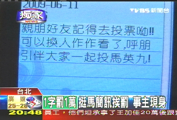 中國(guó)臺(tái)灣網(wǎng)6月12日消息 據(jù)臺(tái)灣TVBS電視臺(tái)報(bào)道,去年臺(tái)灣地區(qū)領(lǐng)導(dǎo)人選舉投票當(dāng)天,一名馬英九支持者發(fā)送了一則50字短信幫馬助選,事后因違反島內(nèi)選舉規(guī)定,被罰50萬(wàn)元(新臺(tái)幣,下同),成為臺(tái)灣史上最貴的短信,1字等于1萬(wàn)元。這名男子黎煌雷昨天接受媒體訪問(wèn),認(rèn)為傳短信是私人行為,并沒(méi)有公開助選,因此不服處罰。