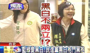 報(bào)道稱,“立法院”議場(chǎng)內(nèi),“立委”穿得花花綠綠難分你我,以后在議場(chǎng)對(duì)決,都穿戰(zhàn)袍的話就會(huì)變成“黑白分明”,國(guó)民黨黑、民進(jìn)黨白,對(duì)綠營(yíng)有無形的加分效果;不過,國(guó)民黨“立委”卻說一幫人穿得這么白,實(shí)在不吉祥。