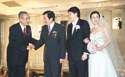 國民黨副主席吳敦義次子吳子文(右二)昨天辦喜宴,馬英九(左二)等臺灣黨政要人幾乎全部到齊。(圖片來源:臺灣《聯(lián)合報(bào)》)