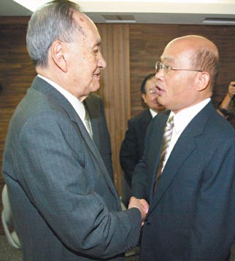 前陳水扁辦公室資政彭明敏(左)昨天舉行新書(shū)發(fā)表會(huì),來(lái)賓幾乎是“獨(dú)派”大會(huì)師,蘇貞昌(右)也到場(chǎng)祝賀。來(lái)源:臺(tái)灣《聯(lián)合報(bào)》