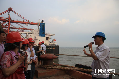 參加“第四屆海峽兩岸企業(yè)發(fā)展與合作論壇”的嘉賓和代表在曹妃甸礦石碼頭聽(tīng)取工程師的介紹。(中國(guó)臺(tái)灣網(wǎng) 肖燕 攝)