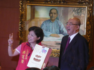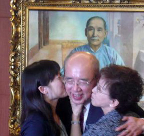 慶生現(xiàn)場,馬英九等人為吳伯雄高唱“生日快樂”,國民黨“立委”洪秀柱、江玲君兩人還獻(xiàn)吻,在吳伯雄臉頰留下了兩個口紅印。(羅煜明)
