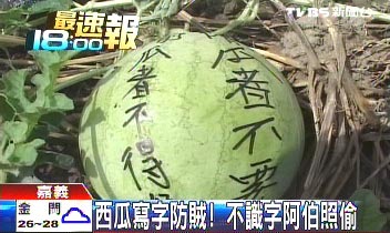 中國臺灣網(wǎng)6月23日消息 據(jù)臺灣TVBS電視臺報(bào)道,嘉義有名婦人因?yàn)樽约悍N的瓜果三番兩次被偷,一氣之下在西瓜上寫上“偷瓜者不要臉”,希望嚇阻小偷,但結(jié)果西瓜還是被偷;警方循線抓到竊賊,才發(fā)現(xiàn)小偷是位不認(rèn)識字的老先生。