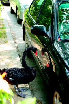 喪夫失子的母黑天鵝,望著車身上自己的影子,以為找到了伴侶,舍不得離去。(圖片來源:臺灣《聯(lián)合報》)