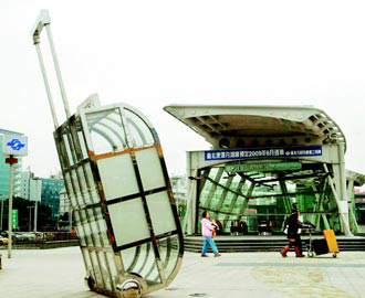 內(nèi)湖線連通臺(tái)北松山機(jī)場,讓兩岸一日生活圈的夢想儼然成形。圖為松山機(jī)場站門口的裝置藝術(shù)“大旅行時(shí)代”。(圖片來源:臺(tái)灣《聯(lián)合報(bào)》)
