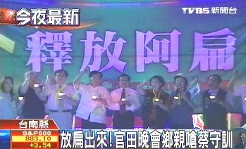 中國臺灣網(wǎng)7月10日消息 據(jù)臺灣TVBS電視臺報道,臺灣本土社團昨天晚上在臺南縣官田鄉(xiāng)西莊惠安宮前廣場舉辦“釋放阿扁”晚會,數(shù)百名陳水扁支持者不時高喊口號,最后一起點燃蠟燭,希望陳水扁能在今天獲釋。