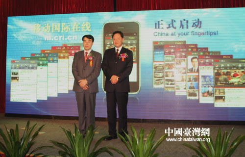 “移動國際在線”今天在北京正式啟動,圖為出席啟動儀式的國家廣電總局副局長田進(左)與國際臺臺長王庚年。(中國臺灣網(wǎng) 張弛 攝)