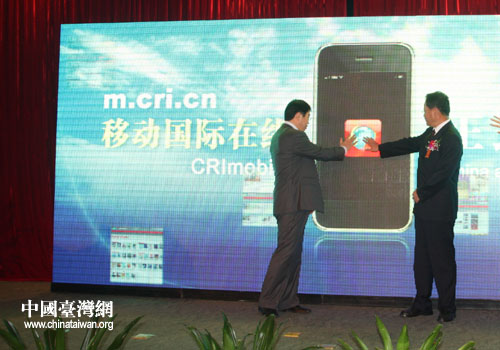 “移動(dòng)國(guó)際在線”今天在北京正式啟動(dòng),圖為國(guó)家廣電總局副局長(zhǎng)田進(jìn)(左)、國(guó)際廣播電臺(tái)臺(tái)長(zhǎng)王庚年按下啟動(dòng)圖標(biāo)。(中國(guó)臺(tái)灣網(wǎng) 張弛 攝)