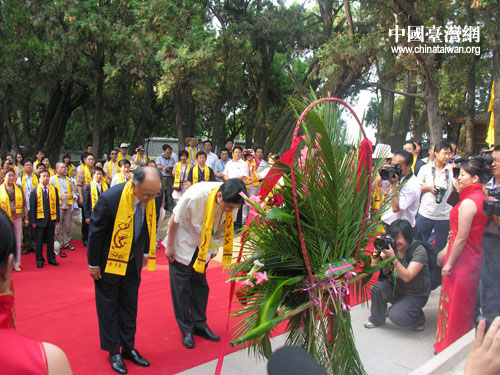 程建人與汪志剛代表兩岸文化界人士向黃帝陵敬獻(xiàn)花籃。(中國臺灣網(wǎng) 蕪?fù)?攝)