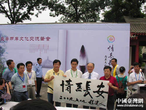 程建人手書(shū)寫(xiě)“情系長(zhǎng)安”四個(gè)大字。(中國(guó)臺(tái)灣網(wǎng) 蕪?fù)?攝)