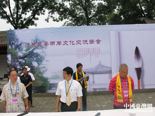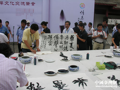 中國(guó)臺(tái)灣網(wǎng)7月20日陜西黃陵縣消息 7月19日,參加“情系長(zhǎng)安——兩岸文化聯(lián)誼行”活動(dòng)的96位臺(tái)灣文化界人士,在黃帝陵恭祭軒轅黃帝,并在祭陵結(jié)束后來(lái)到軒轅廟古柏院。兩岸的書(shū)法家代表在千年古柏樹(shù)下,進(jìn)行了一場(chǎng)別開(kāi)生面的文化交流筆會(huì)。