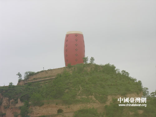 安塞縣城外的小山上矗立著層樓高的巨大腰鼓標志 (中國臺灣網(wǎng) 蕪同 攝)
