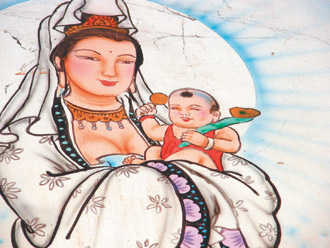 臺灣新竹縣惠昌宮墻上彩繪的“觀音送子圖”,觀世音被畫成爆乳,文史工作者批“不倫不類”,廟方挺創(chuàng)作者,表示沒有人反映不妥。(圖片來源:臺灣《聯(lián)合報》)
