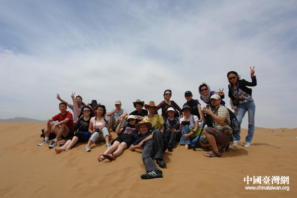 7月24日,來自海峽兩岸媒體的記者們在寧夏中衛(wèi)市沙坡頭景區(qū)合影留念。(中國臺灣網(wǎng) 楊永青 攝)