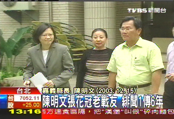 民進(jìn)黨籍嘉義縣長(zhǎng)陳明文(右)和民進(jìn)黨“立委”張花冠(中)的緋聞一直揮之不去。圖片來源:臺(tái)灣TVBS電視臺(tái)