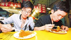 Visa4日發(fā)布“大中華區(qū)臺灣旅游偏好調(diào)查報(bào)告”指出,大陸及香港旅客赴臺時夜市列入必訪行程,逾7成最愛的夜市小吃就是蚵仔煎,來自山西太原的江楓(右)與汪偉昨晚到士林夜市嘗鮮,兩人都說口味不是很習(xí)慣,不過蠻好吃的。(圖片來源:臺灣《中國時報(bào)》)