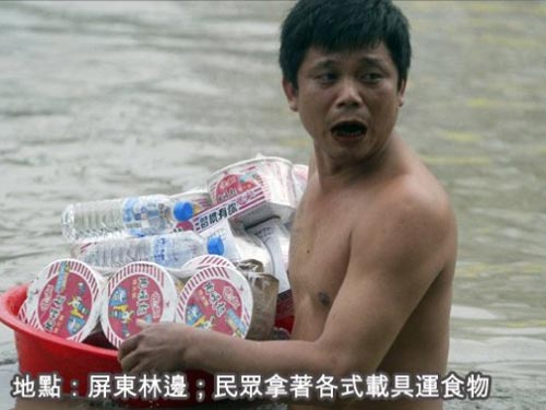 屏東東港,民眾涉水采買(mǎi)日用品回家。來(lái)源:臺(tái)灣《聯(lián)合報(bào)》