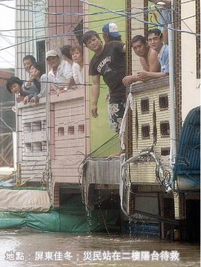 屏東佳冬,災(zāi)民站在二樓陽(yáng)臺(tái)待救。來(lái)源:臺(tái)灣《聯(lián)合報(bào)》