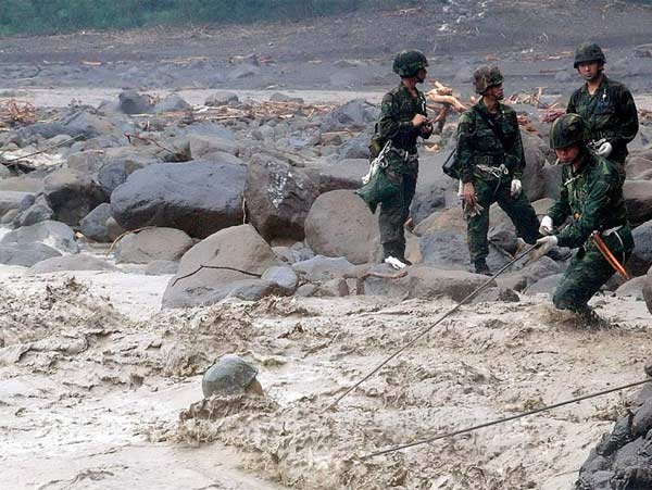 13日,臺(tái)軍聯(lián)合搜救任務(wù)地面部隊(duì)452名特戰(zhàn)隊(duì)員,編成50個(gè)小組,沿8條路線挺進(jìn)高雄縣甲仙鄉(xiāng)、桃源鄉(xiāng)、六龜鄉(xiāng)、茂林鄉(xiāng)、那瑪夏鄉(xiāng)、屏東縣霧臺(tái)鄉(xiāng)、嘉義梅山鄉(xiāng)、阿里山鄉(xiāng)、南投縣集集鎮(zhèn)、信義鄉(xiāng)等村落,進(jìn)行地球式搜索任務(wù)。