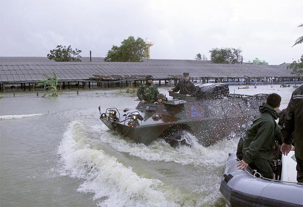 臺(tái)媒圖片:臺(tái)陸軍裝甲車(chē)輛在洪水中搜尋。
