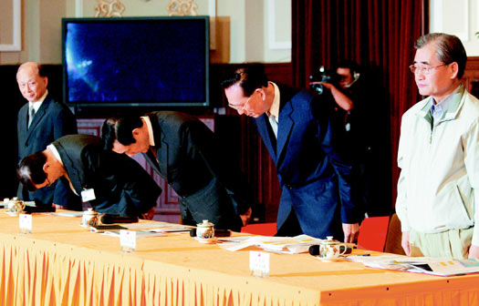 馬英九(右三)昨天率臺(tái)當(dāng)局“首長(zhǎng)”在記者會(huì)上道歉。他與蕭萬長(zhǎng)(左二)、“行政院副院長(zhǎng)”邱正雄(右二)鞠躬后定住7秒鐘,一時(shí)不察的“國(guó)防部長(zhǎng)”陳肇敏(左一)、“交通部長(zhǎng)”毛治國(guó)(右一)卻已先起身。圖片來源:臺(tái)灣《聯(lián)合報(bào)》