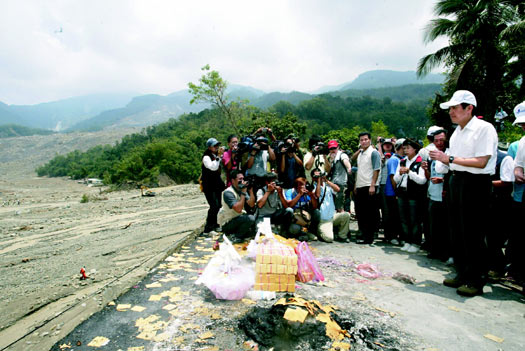 馬英九與高雄縣長(zhǎng)楊秋興等官員捻香向罹難者致祭,望著全遭土石掩埋的小林村,肅殺場(chǎng)景讓馬英九神情極為凝重。