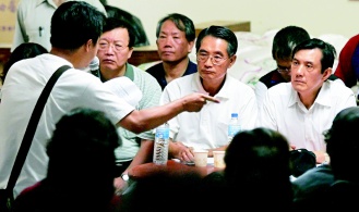 馬英九(右一)、“農(nóng)委會(huì)主委”陳武雄(右二)與小林村災(zāi)民座談,說明將建組合屋及永久房屋安置災(zāi)民。圖片來源:臺(tái)灣《聯(lián)合報(bào)》