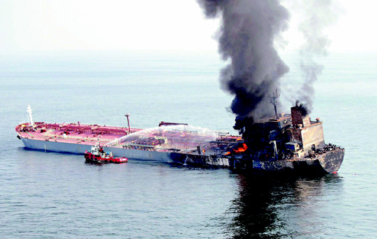 臺塑集團旗下油輪“立善輪”18日晚間在馬六甲海峽遭英國籍貨輪撞擊,船上5萬8千噸輕油部分外泄并引發(fā)大火。馬來西亞當局出動救災人員、直升機搶救,仍有9名大陸籍船員下落不明,含船長在內的2名來自臺灣地區(qū)的船員則獲救。圖為消防人員19日持續(xù)噴水救災。圖片來源:臺灣《聯合報》