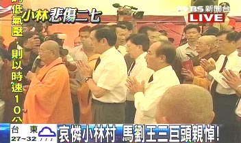 馬英九、臺(tái)當(dāng)局“行政院長(zhǎng)”劉兆玄和臺(tái)灣“立法院長(zhǎng)”王金平等人,22日上午參加高雄縣甲仙鄉(xiāng)小林村罹難者祈福追思法會(huì)。來(lái)源:臺(tái)灣TVBS電視臺(tái)
