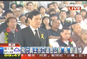 馬英九23日出席在“88”水災(zāi)救援任務(wù)中殉職的臺灣“空中勤務(wù)總隊”飛行員王宗立追思公祭,頒發(fā)褒揚令并慰問家屬。圖片來源:臺灣TVBS電視臺