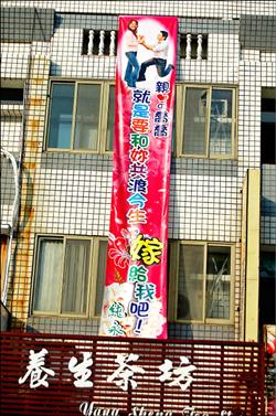 林純永在“七夕”于女友上班的彰化基督教醫(yī)院二林分院旁,懸掛大型布條求婚。