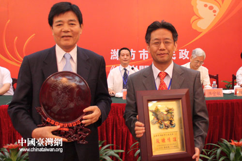 海峽兩岸農(nóng)業(yè)融合升級合作懇談會今天下午在濰坊舉行,圖為濰臺兩地互贈紀(jì)念品。(中國臺灣網(wǎng) 張弛 攝)
