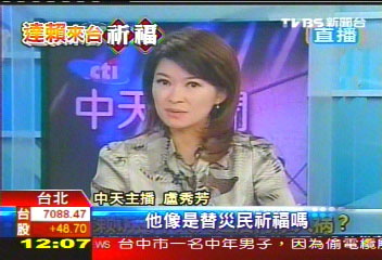 8月31日晚間9點半,臺灣中天新聞臺主播盧秀芳在與大陸電視臺連線討論達賴赴臺話題時,引述記者的報道表示,達賴去災區(qū)根本沒通知災民,干脆不要來。