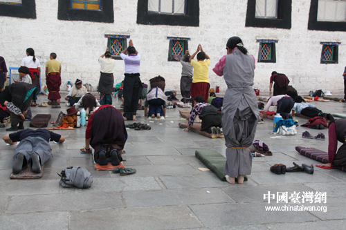 大昭寺前虔誠(chéng)的信徒(中國(guó)臺(tái)灣網(wǎng) 李典典 攝)