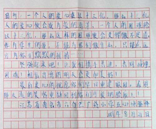中國(guó)臺(tái)灣網(wǎng)9月22日北京消息 8月初,“莫拉克”臺(tái)風(fēng)給臺(tái)灣中南部地區(qū)造成重大的人員和財(cái)產(chǎn)損失。大陸同胞心系臺(tái)灣災(zāi)區(qū)。南京市小學(xué)生駱懌日前致信臺(tái)灣災(zāi)區(qū)的小朋友,表達(dá)了對(duì)他們的牽掛,并鼓勵(lì)災(zāi)區(qū)的小朋友們堅(jiān)強(qiáng)起來,勇敢面對(duì)困難,攜手走向美好的明天。