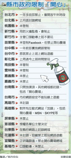 基隆市政府也已著手管制市政府網(wǎng)絡(luò),完成計算機設(shè)定后即不得連上開心農(nóng)場。臺北縣政府上月28日起中斷與開心農(nóng)場聯(lián)機,停止與開心農(nóng)場聯(lián)機后,約減少1%網(wǎng)絡(luò)流量,員工抱怨這是小題大作。(芮文輝)