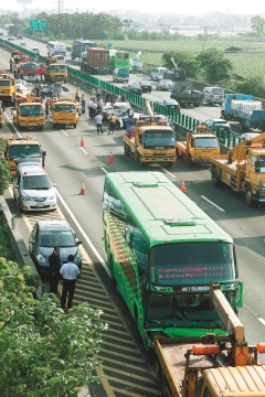 臺警方調(diào)查,司機(jī)謝東宇前晚9時40分許滿載19.5噸丁烷的化學(xué)槽車,行經(jīng)中山高北上201公里花壇路段,疑因閃避前方由鄧志隆駕駛的爆胎小貨車,急打方向盤失控,槽車沖出護(hù)欄,翻落駁坎,兩車司機(jī)輕傷。警察擔(dān)心槽車爆炸,前晚10時起封閉外側(cè)兩車道,僅開放內(nèi)側(cè)車道,導(dǎo)致大塞車,車陣超過10公里,直到昨天中午仍未排除。
